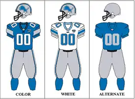 To celebrate their 75th season playing as the Lions,[note 1] the team wore a special throwback replica of the uniforms used in 1934, their first season as the Lions, for two home games. The uniforms had blue jerseys with silver lettering, solid silver pants, blue socks, and solid silver helmets (as helmets were leather back then). This replaced their black alternate jersey used in the 2005 to 2007 seasons.