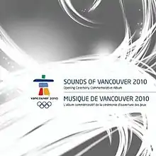 A soundtrack, Sounds of Vancouver 2010: Opening Ceremony Commemorative Album (French: Musique de Vancouver 2010 : L'album commémoratif de la cérémonie d'ouverture des Jeux), was released through the iTunes Store on February 12, 2010, containing many studio recordings of the performances from the opening ceremony.[63] It charted at #6 on the Canadian Albums Chart, and has sold over 50,000 copies.[64] The song performed by Garou, "Un peu plus haut, un peu plus loin (A little higher, a little further)", was released on the accompanying soundtrack for the closing ceremony.