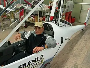 | A Silent 2 Targa fuselage with a pilot trying out the cockpit | |