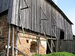 The congregation owned the deteriorating castle until the beginning of the 19th century when it was confiscated by the Tsarist authorities pursuant to the Russification policies and given to an Eastern Orthodox monastery.[6] In 1923, after the land reform, the property was divided and sold to farmers.[6] In the early 20th century, a farmhouse was built in the southwestern corner of the former castle.[7] During the Soviet era, the former castle belonged to a kolkhoz and suffered further damage as ramparts were plowed over, particularly on the southern side.[7] Around 1950, the second floor of the surviving eastern gate was demolished and bricks used for the construction of a dam on the Siesartis River.[5] In 1972, the castle was added to the registry of cultural monuments of Lithuania but due to a mistake it was described as a former fortified monastery.[1] Until the late 1990s and early 2000s, the castle attracted very little attention from archaeologists or historians.[1] The first archaeological excavation was carried out in 1987. The archaeologists removed debris and explored several sections in the territory, but no valuable artifacts were found and the excavation report was not submitted.[1] The same year, the ruins were covered by temporary wooden structures to protect them from further erosion. With financial assistance from Michal Giedroyc, more extensive excavations were carried out in 1999–2003 that explored an area of 399 square metres (4,290 sq ft).[4][5] In 2015, the former castle was declared a state protected monument.[8]