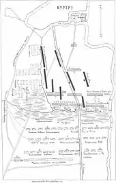 Some of the French footmen were trampled to death by the armoured cavalry, but most managed to get back around them or through the gaps in their lines.[18] The cavalry advanced rapidly across the streams and ditches to give the Flemish no time to react.[18] The brooks presented difficulties for the French horsemen and a few fell from their steeds.[18] Despite initial confusion, the crossing was successful in the end.[18] The French reorganized their formations on the other side to maximize their effectiveness in battle.[18]