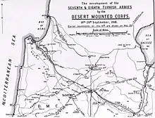 Following the successful advance and virtual encirclement of the Ottoman Seventh and Eighth Armies in the Judean Hills with the captures of Afulah and Nazareth, the Yildirim Army Group general headquarters was out of communication with its three armies.[3][4][5] All direct routes northwards were controlled by the Desert Mounted Corps. Thus, the retreating Seventh Army and what remained of the Eighth Army were forced to withdraw along minor roads or tracks, eastwards across the Jordan River, towards the Hedjaz railway.[6][7] The capture of Haifa was essential for any further advances by the Egyptian Expeditionary Force since the roads leading to the port were little more than tracks and its capture was urgently required for landing supplies.[8][9]