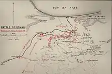 The 52nd (Lowland) Division developed a strong defensive position at Romani which had its left flank on the Mediterranean Sea, here a series of redoubts were built running southwards from Mahamdiyah along the line of high sand hills about 7 miles (11 km) to a dune known as Katib Gannit 100 feet (30 m) high. This line of sand hills, which were high enough to see Katia oasis from, marked the eastern edge of an area of very soft and shifting sand beyond which were lower dunes and harder sand where movement by both infantry and mounted forces was considerably easier. Between the shore at the western end of the Bardawil Lagoon and Katib Gannit (the principal tactical point on the eastern slopes of the Romani heights), the infantry constructed a line of 12 redoubts about 750 yards (690 m) apart, with a second series of redoubts covering the Romani railway station and the right of the defensive position which curved like a hook westward, then northward. A total of 18 redoubts were constructed, which when fully garrisoned held from 40 to 170 rifles each, with Lewis guns and an average of two Vickers machine guns allotted to each position; they were well wired on the right side of each of the positions, although there was no wire between the redoubts.[46] This defensive line was supported by artillery.[47][48]