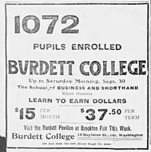 - 1 2 "Burdett Business College". The Boston Globe. August 13, 1891. p. 3. Retrieved April 22, 2020 – via newspapers.com.
