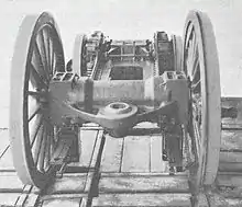 The 'cannon box' bearing was introduced by George Stephenson on his locomotive Locomotion of 1825 for the Stockton and Darlington Railway.[1] One of the axles was carried in a 'cannon box' bearing that was pivoted centrally and could tilt from side to side.[1] Unlike Stephenson's earlier locomotives and their steam springs, this new suspension had no springing but was a compensated suspension: as one side was raised, the bearing tube pivoted and the other side was pushed downwards. Although not giving a stable ride for the locomotive, it did allow the wheels to follow uneven track. Rails of this period were short pieces of cast iron rather than lengths of rolled steel and had frequent, often misaligned, joints.