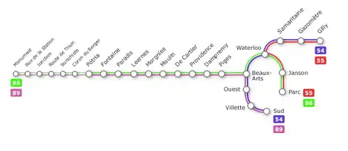 Line 89 was a line on the Charleroi Premetro in Belgium operated by TEC Charleroi, running from Charleroi-South railway station (aka. Sud), in downtown Charleroi, to Anderlues (west of Charleroi), via the southwestern part of the downtown loop.