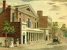 The Chestnut Street Theatre (originally named the New Theatre) was the brainchild of Thomas Wignell and Alexander Reinagle who in 1791 convinced a group of Philadelphia investors to build a theater suitable for Wignell's company to perform in. Wignell had not yet formed his company when the New Theatre was being set up to be built, but as the New Theater was being built, Wignell was in England recruiting actors to be a part of his company.[2] The New Theater's design, modeled after the Theatre Royal, Bath, was made possible by John Inigo Richards, Wignell's brother-in-law, who obtained architect Thomas Greenway's original plans.[3]