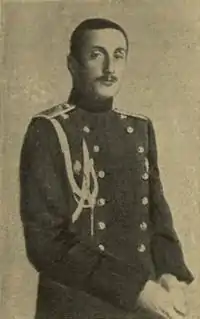 Prince Konstantine Bagration of Mukhrani (Georgian: კონსტანტინე ბაგრატიონ-მუხრანელი) (14 March 1889 – 1 June 1915) was a Georgian nobleman from the House of Mukhrani. A member of the Russian Imperial Guard, Konstantine fought with distinction and died in World War I - actions for which he posthumously received the Order of St. George, the highest military decoration of the Russian Empire. Konstantine was in a brief but controversial marriage with Princess Tatiana Constantinovna of Russia, a member of the Russian Imperial Family.