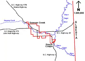 At the foot of Bear Mountain ridge, the city developed around the Dawson Creek watercourse which flows eastward into the Pouce Coupe River. The city is located on the Pouce Coupe Prairie in the southwestern part of the Peace River Country, 72 km (44.7 mi) southeast of Fort St. John, and 134 km (83.3 mi) northwest of Grande Prairie, Alberta. According to the Canada Land Inventory, the city is on soil that has moderate limitations, due to an adverse climate, that restrict the range of crops or require moderate conservation practices.[30] The land is flat, but slopes upwards in the northeastern corner elevating a residential area over the rest of the city.