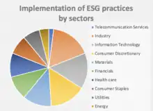 The implementation of ESG practices differs according to the sectors. The sectors of the industry, information technology, consumer discretionary, and materials are the sectors which have the biggest interest in the ESG practice (see figure 2).[46] According to the sector, the weights attributed to the relative importance of environmental, social, and governance factors change. Over time, the weighting of categories is subject to change. For instance, according to Nagy et al. (2020), the governance factor recorded a significant growth in weight, rising from 19% in 2007 to 27% in 2019 and then to 31% in 2020. Overall, an MSCI study revealed that: the average weight of the environmental pillar was 30%, social factors was 39%, and governance elements were 31% across all the sectors.[47]