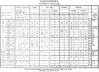 Chart of Wulff's phonetic transcription system from 1888. Many of the symbols would end up being used by the International phonetic alphabet (IPA), but others, such as Greek τ δ ν for dental [t̪ d̪ n̪] and π μ for [p̪ m̪], would not be. Script and rotated letters would be used by the IPA, but not bold or italic typeface. This system includes a level of phonetic detail in its letters that the IPA transcribes with diacritics.