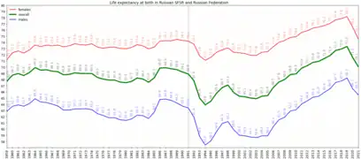 As of 2013, the average life expectancy in Russia was 65.1 years for males and 76.5 years for females.[6] The average Russian life expectancy of 71.6[7] years at birth is nearly 5 years shorter than the overall average figure for the European Union or the United States.[8]