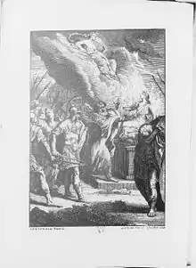 Act V. In her despair Iphigénie, prevented from leaving the city and forbidden ever again to speak to Achille, feels that sacrificial death is the only choice left. Achille arrives to offer her the support of his troops. She continues to defend her father and insists on the need for her sacrifice. Achille leaves her, still resolved to defend her. Her mother's entreaties are met with a similar response; she departs to make her own way to the sacrificial altar. Clytemnestre is beside herself with grief and despair, conjuring up the god of thunder at the end of her apocalyptic invocations. Arcas comes to fetch her on behalf of Achille, who with his soldiers has interrupted the sacrifice; but then Ulysse arrives to reassure Clytemnestre that her daughter has been saved as the result of an unexpected miracle. At the moment that Achille and the other Greeks were facing each other for combat, the high priest Calchas revealed that, according to the oracle, Eriphile, the secret daughter of Hélène and Thésée, was also called "Iphigénie" and it was she whom the gods had required to be sacrificed. Eriphile then stabbed herself on the altar, her death being immediately followed by a cosmic cataclysm: lightning, thunder, winds, motions of the waves and a pyre of flames in which the goddess Diana herself appeared. Clytemnestre leaves to join her now reconciled family and future son-in-law, thanking the gods for this deliverance.