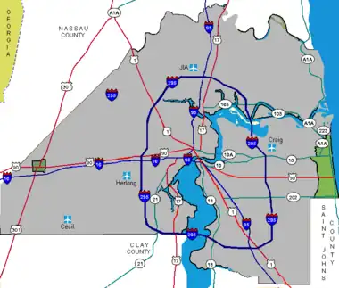 Interstate Highways 10 and 95 intersect in Jacksonville, creating the busiest intersection in the region with 200,000 vehicles each day.[6] Interstate 10 ends at this intersection (the other end being in Santa Monica, California).