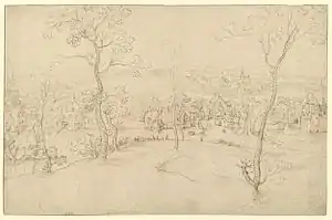 In his earliest landscape drawing of a View over a tree-covered hill towards a village on a river (1573, Kunsthalle Hamburg) and in the series of paintings of the Four Seasons (1577, Museum of Fine Arts (Budapest) Jacob Grimmer showed a preference for depicting realistic flat Flemish landscapes with villages and farmhouses and populated with rural residents.[7] The small figures in these scenes are set in graduated zones of recession along rolling hills towards a horizon in the middle of the panel.[8] These landscapes with figures and small anecdotal scenes are rendered in a naturalist manner. Grimmer abandoned the contrived world landscape of the earlier generation in favour of a simplicity and authenticity never seen before.[2]