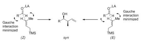 The Mukaiyama aldol reaction and the Sakurai reaction refer to the addition of silyl enol ethers and allylsilanes to carbonyl compounds, respectively. Only under Lewis acid catalysis do these reactions occur under synthetically useful conditions. Acyclic transition states are believed to be operating in both reactions for either 1,2- or 1,4- addition, and steric factors control stereoselectivity. This is in contrast with the rigid Zimmerman-Traxler cyclic transition state that has been widely accepted for the aldol reaction with lithium, boron, and titanium enolates. As a consequence, the double bond geometry in the silyl enol ether or allylsilane does not translate well into product stereochemistry. A model for the Sakurai 1,2-addition, proposed by Kumada, is presented in the scheme below;[21] the syn diastereomer is predominant when the (E) silane is used, and also slightly favored when the (Z) silane is used. A similar analysis by Heathcock[22] explains the fact that, with simple substrates, there is essentially no diastereoselectivity for the intermolecular Mukaiyama aldol reaction.