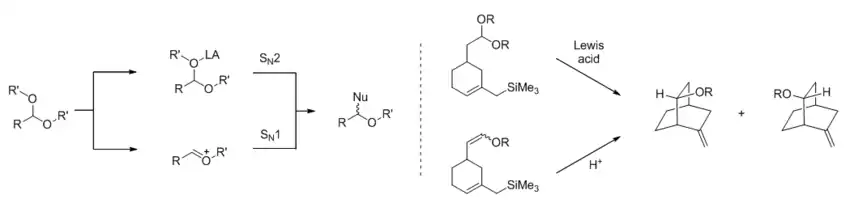 In reactions with polar mechanisms, Lewis acid catalysis often involves binding of the catalyst to Lewis basic heteroatoms and withdrawing electron density, which in turn facilitates heterolytic bond cleavage (in the case of Friedel-Crafts reaction) or directly activates the substrate toward nucleophilic attack (in the case of carbonyl addition reactions). The dichotomy can have important consequences in some reactions, as in the case of Lewis acid-promoted acetal substitution reactions, where the SN1 and SN2 mechanisms shown below may give different stereochemical outcomes. Studying the product ratio in a bicyclic system, Denmark and colleagues showed that both mechanisms could be operative depending on the denticity of the Lewis acid and the identity of the R' group.[3]