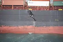 On 8 January 2012, it was reported that the Rena had broken in two, and while the bow section remained firmly grounded on the reef, the split had caused both sections to slew away from each other and settle lower in the water.[21] This caused further debris and oil to be released into the sea. By 10 January the stern section had been submerged almost completely,[6] and on 4 April it slipped further down the reef and disappeared completely from the surface.[22]