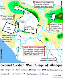 The siege of Akragas took place in 406 BCE in Sicily; the Carthaginian enterprise ultimately lasted a total of eight months. The Carthaginian army under Hannibal Mago[1] besieged the Dorian Greek city of Akragas in retaliation for the Greek raids on Punic colonies in Sicily. The city managed to repel Carthaginian attacks until a relief army from Syracuse defeated part of the besieging Carthaginian army and lifted the siege of the city.