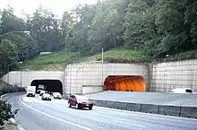 The Vista Ridge Tunnels are highway tunnels through the Tualatin Mountains ("West Hills") of Portland, Oregon, United States. Located in the Goose Hollow neighborhood,[1] the tunnels pass through a hillside locally known as Vista Ridge which is a half mile (1 km) west of downtown Portland. Sunset Highway, also known as U.S. Route 26, is carried through the tunnels, three lanes in each direction. They are Oregon's busiest tunnels.