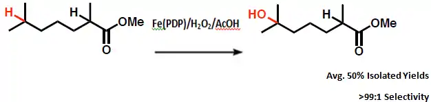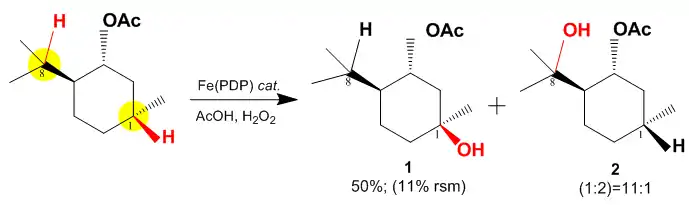 The reaction selectivity is highly influenced by electronics due to the highly electron withdrawing ester group present in the substrate. For that reason the reaction proceeds with oxidation at the tertiary C–H bond most remote from the ester with reaction yields of greater than 50% and selectivities of >99:1.[5] Electronically guided site-selectivity is also observed for secondary sites, affording yields of mono-oxidized products of 50% or greater.[6]