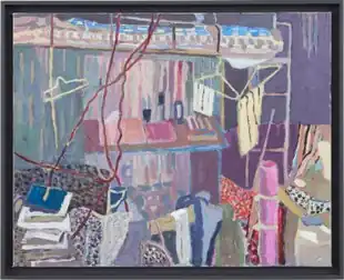 Critics noted a significant turn in Ji's exhibition, "The Sunflower Turned Its Back" (James Cohan Gallery, 2022), toward new imagery (flowers, a portrait) and a new medium (acrylic on canvas) that further conveyed the global, universal nature of his subject matter.[40] Stylistically less caricatured or expressionist, these works were painted in thickly applied, dry, chalky colors that exploited the saturation and opacity of acrylic and created interplay between abstraction and representation, flat pattern and volumetric form.[40][2] In paintings such as Bunk Bed or Satellite Dish on a Bed (both 2023), New Yorker critic Johanna Fateman noted juxtapositions of "dappled light and dynamic clutter [recalling] early Matisse" with the disarray of jumbled belongings on streets and hasty departures, which created tonal shifts between gaiety and gravitas.[2]